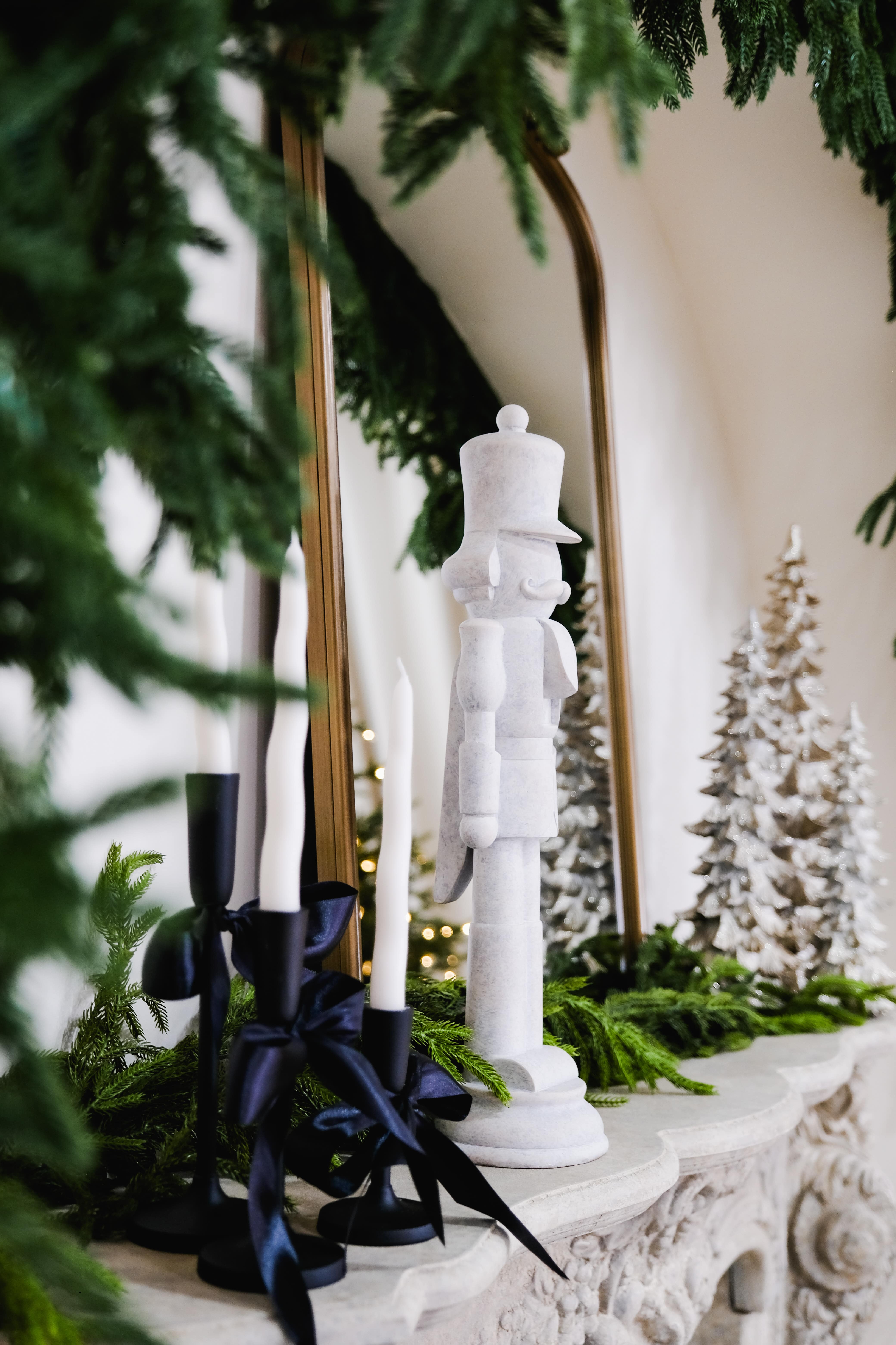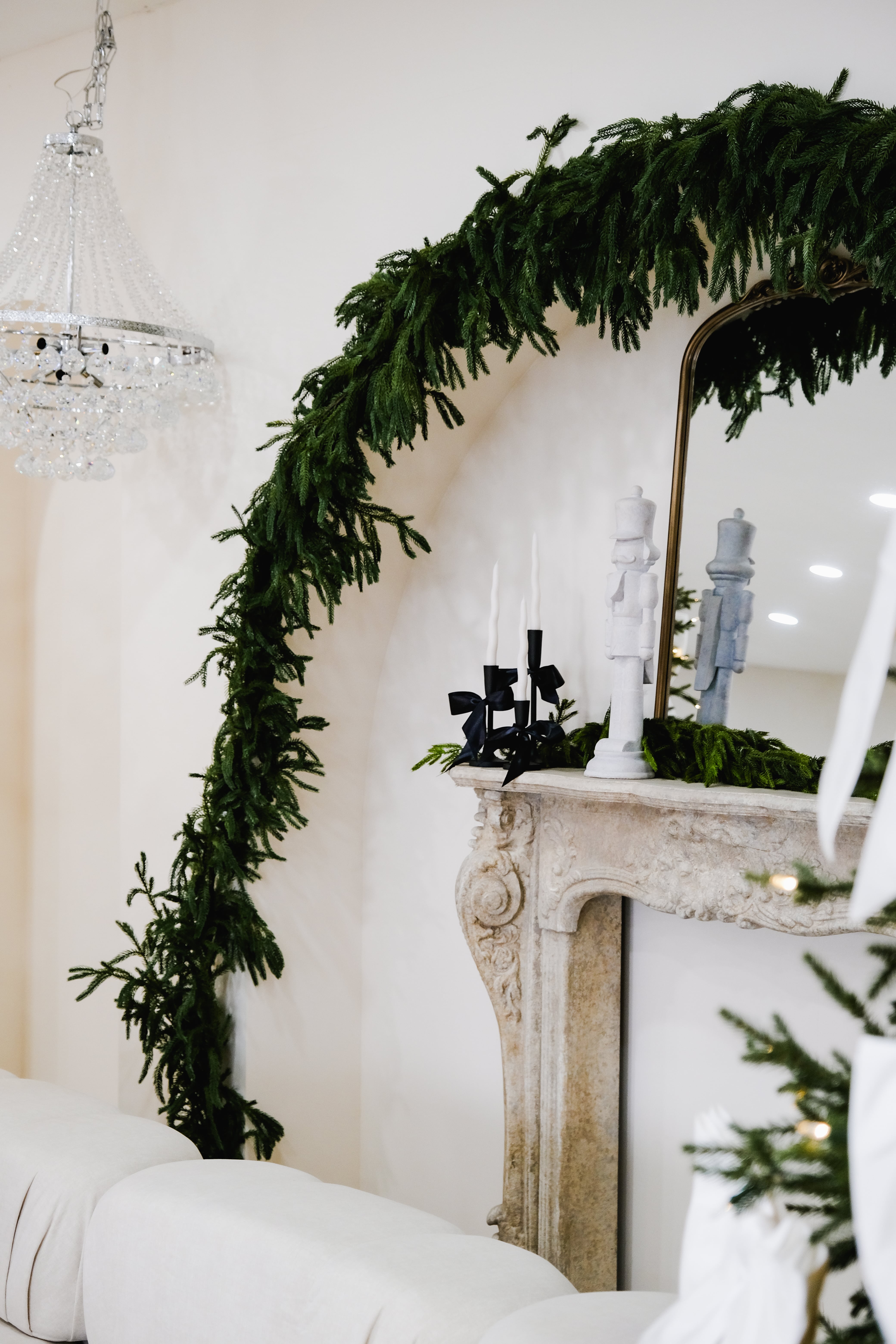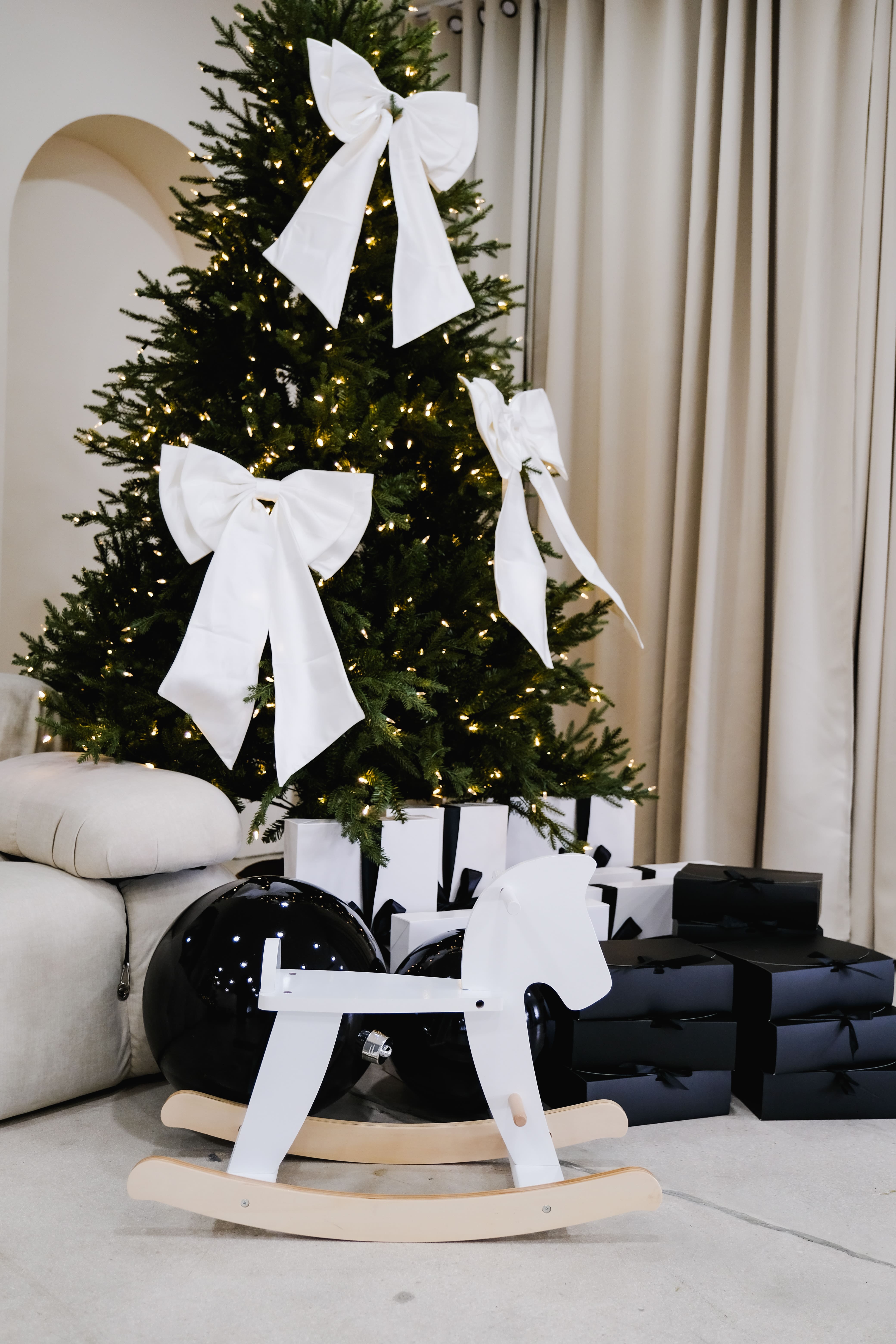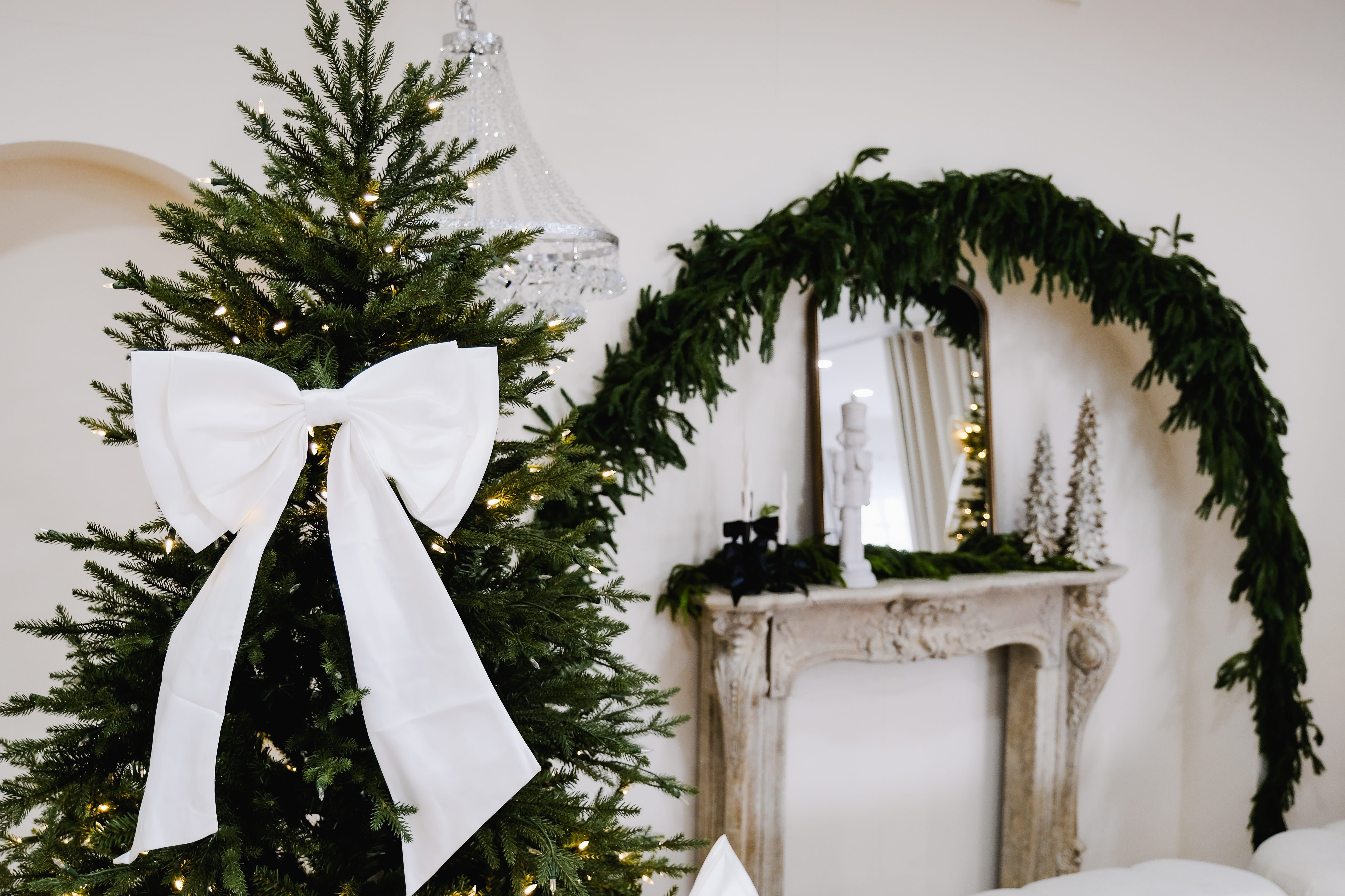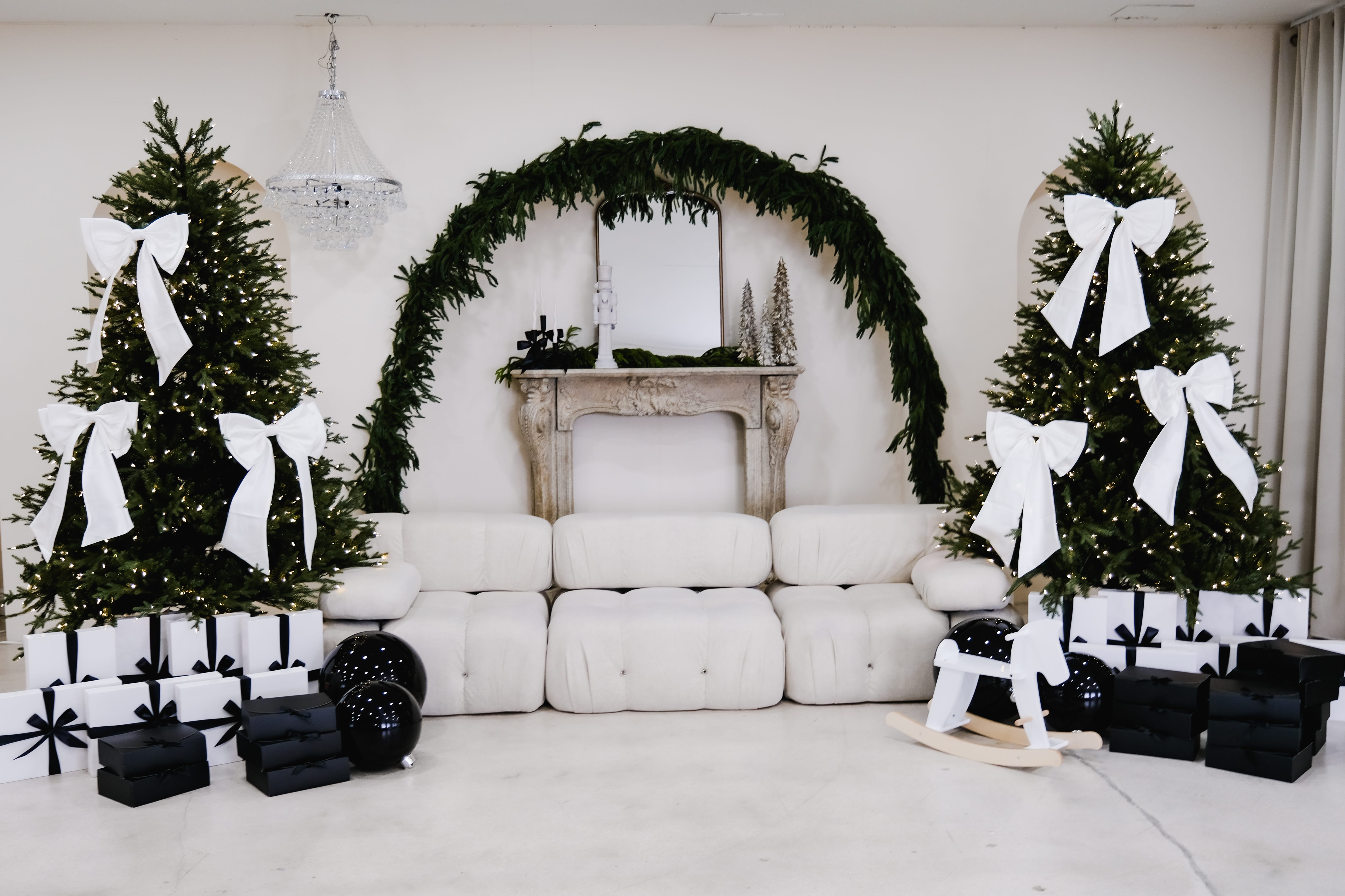 An ivory sofa sits in front of an arched fireplace with a vintage mirror. Two Christmas trees with crisp white bows frame the scene. Black-and-white gift boxes and a few crystal accents keep everything clean and modern. Warm twinkle lights and soft neutrals create a calm, polished holiday look with simple lines and plenty of breathing room.