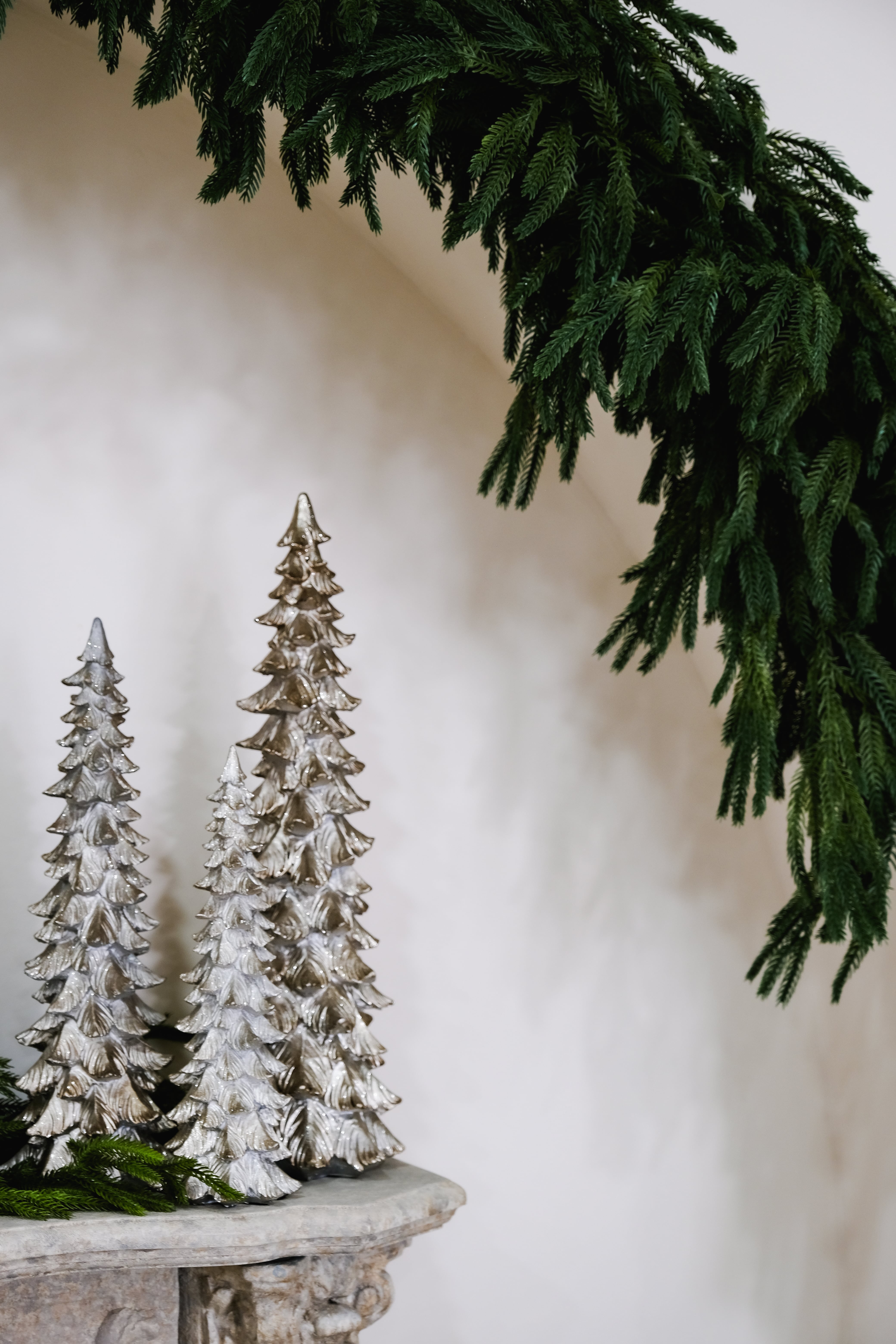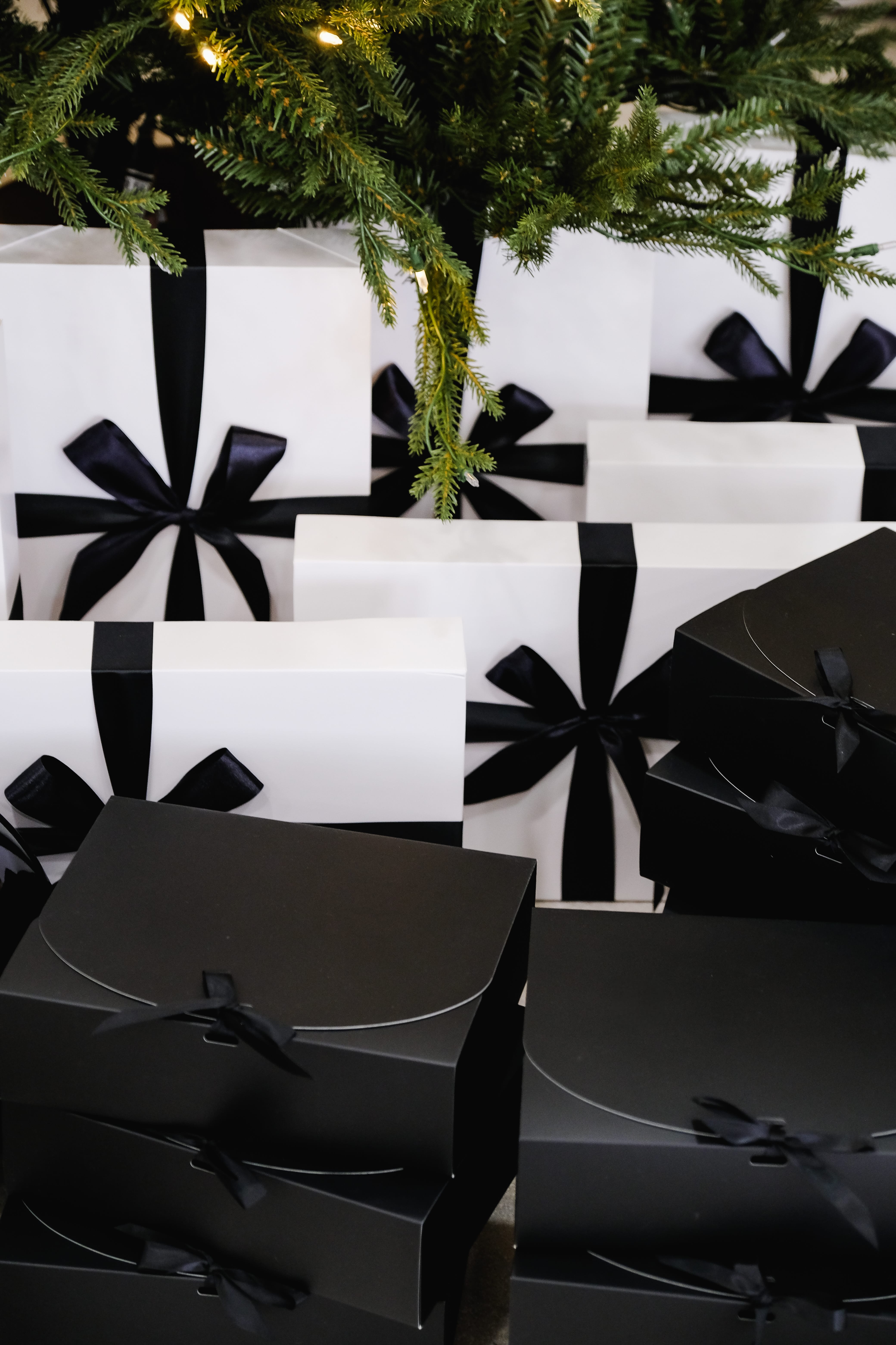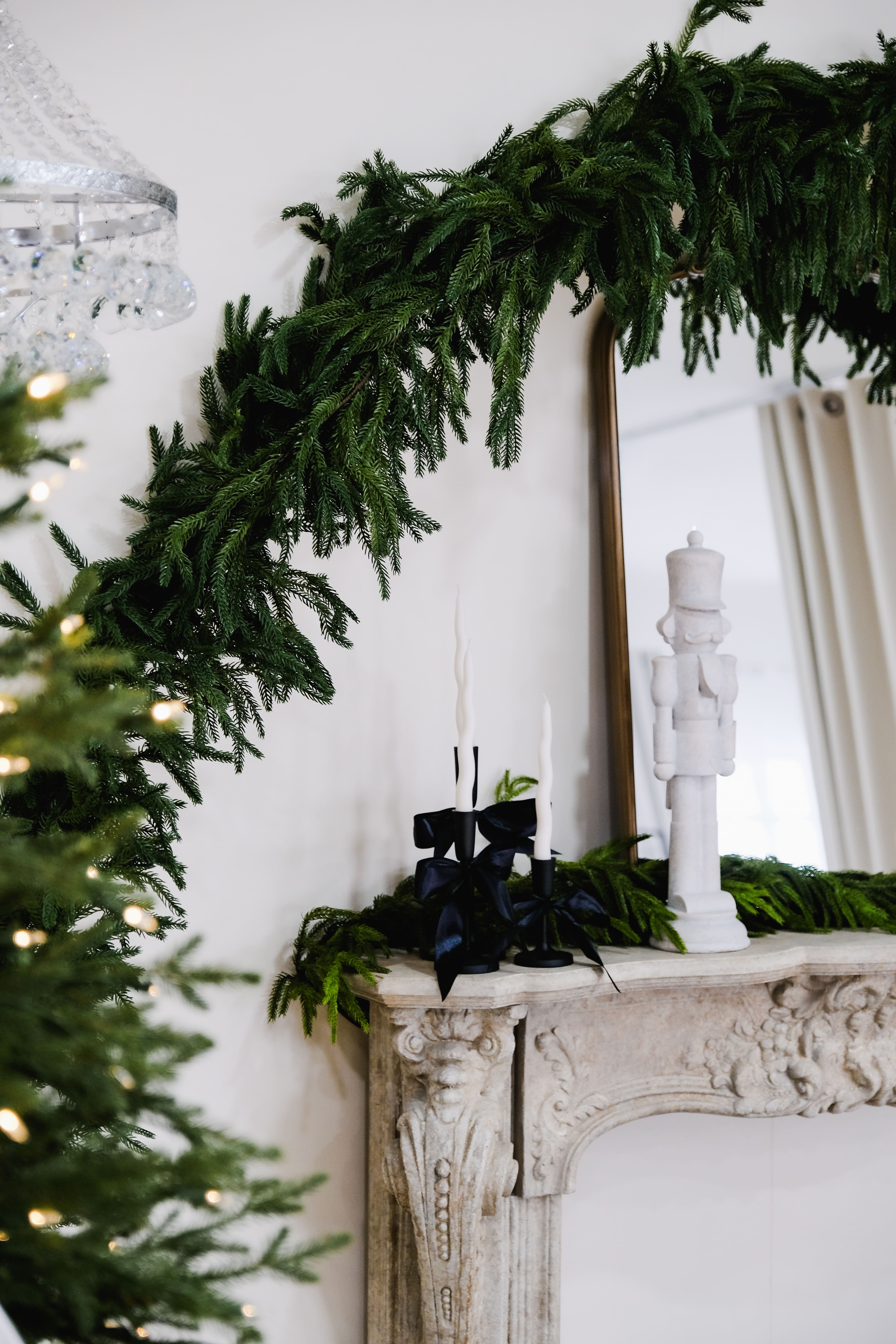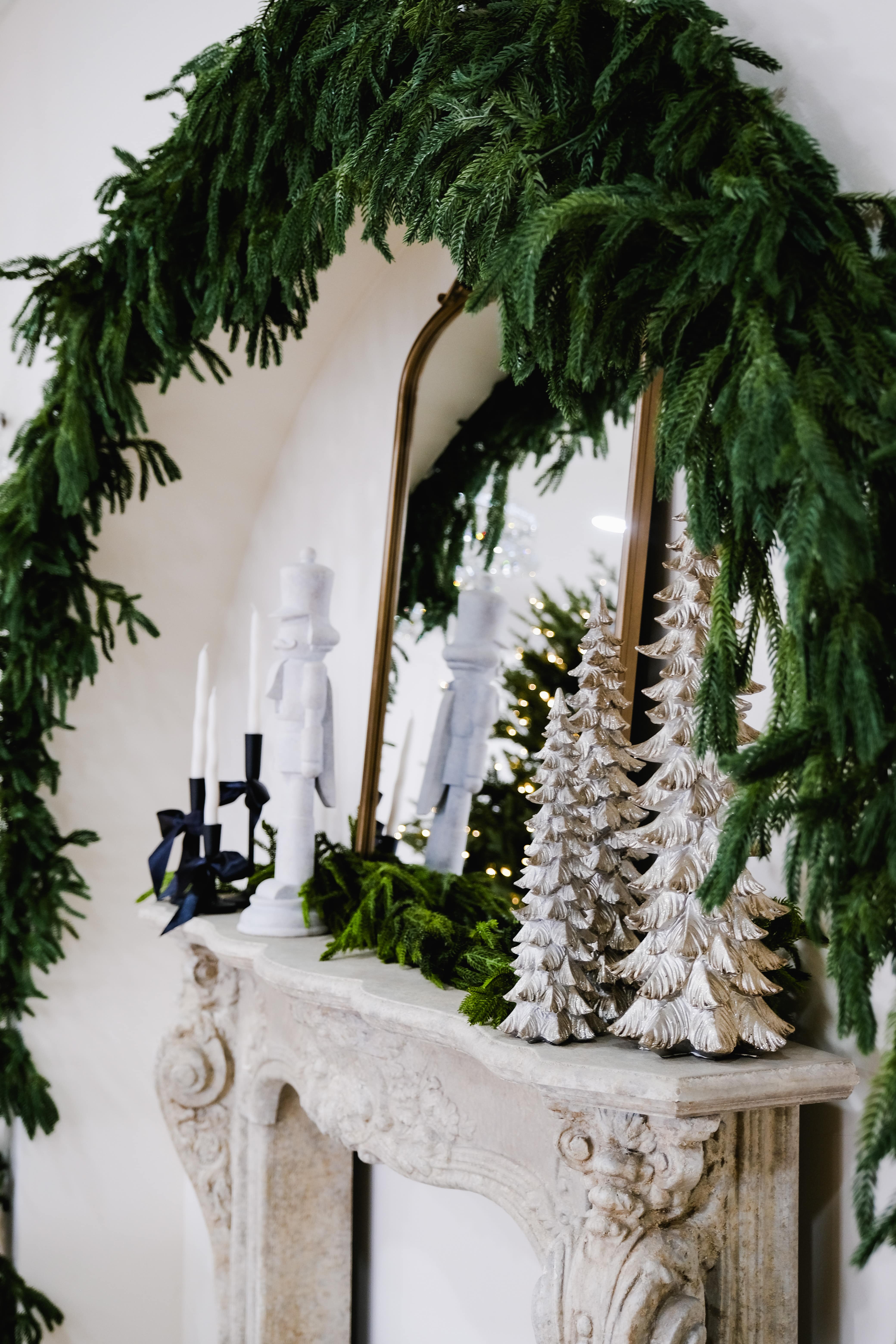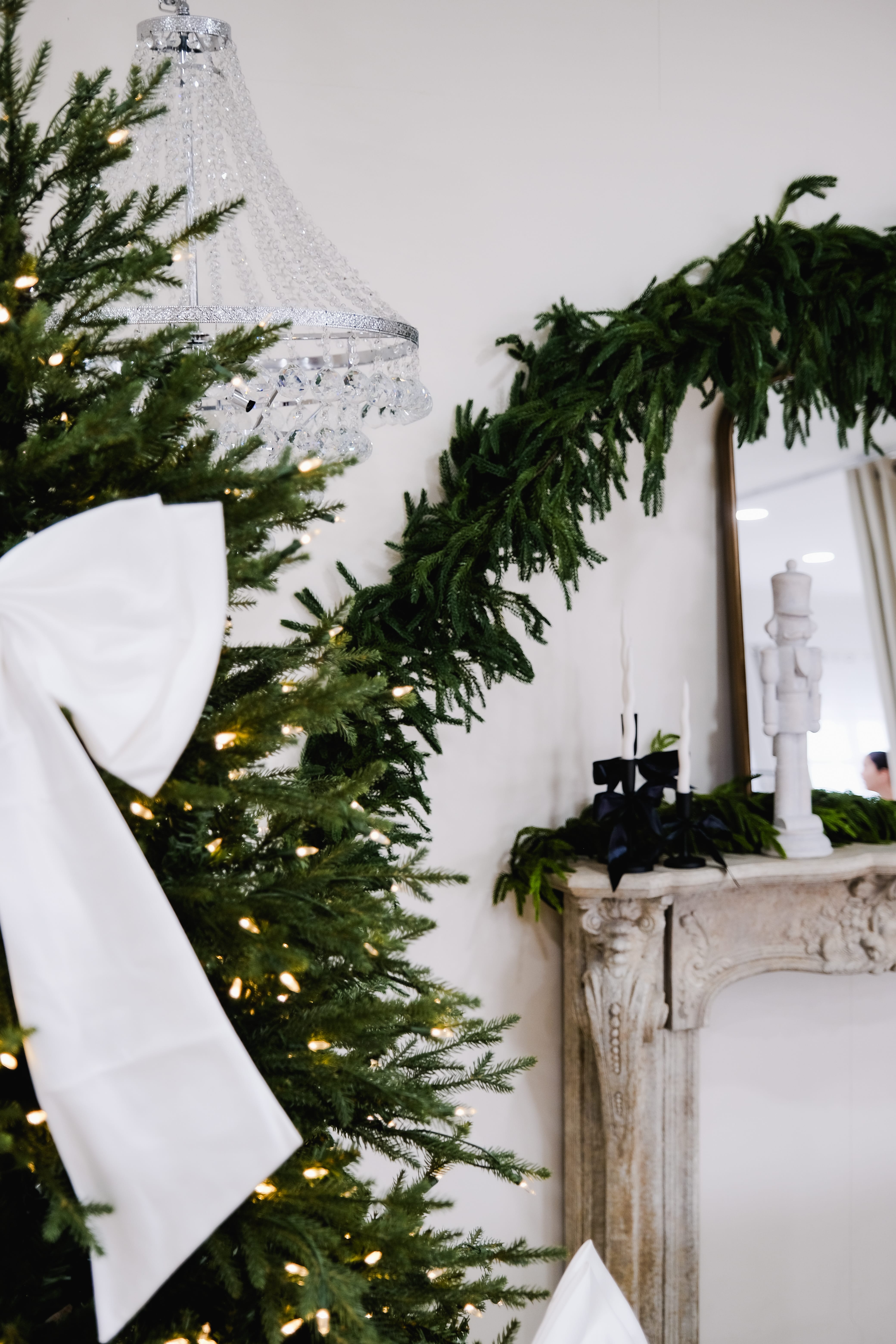 An ivory sofa sits in front of an arched fireplace with a vintage mirror. Two Christmas trees with crisp white bows frame the scene. Black-and-white gift boxes and a few crystal accents keep everything clean and modern. Warm twinkle lights and soft neutrals create a calm, polished holiday look with simple lines and plenty of breathing room.