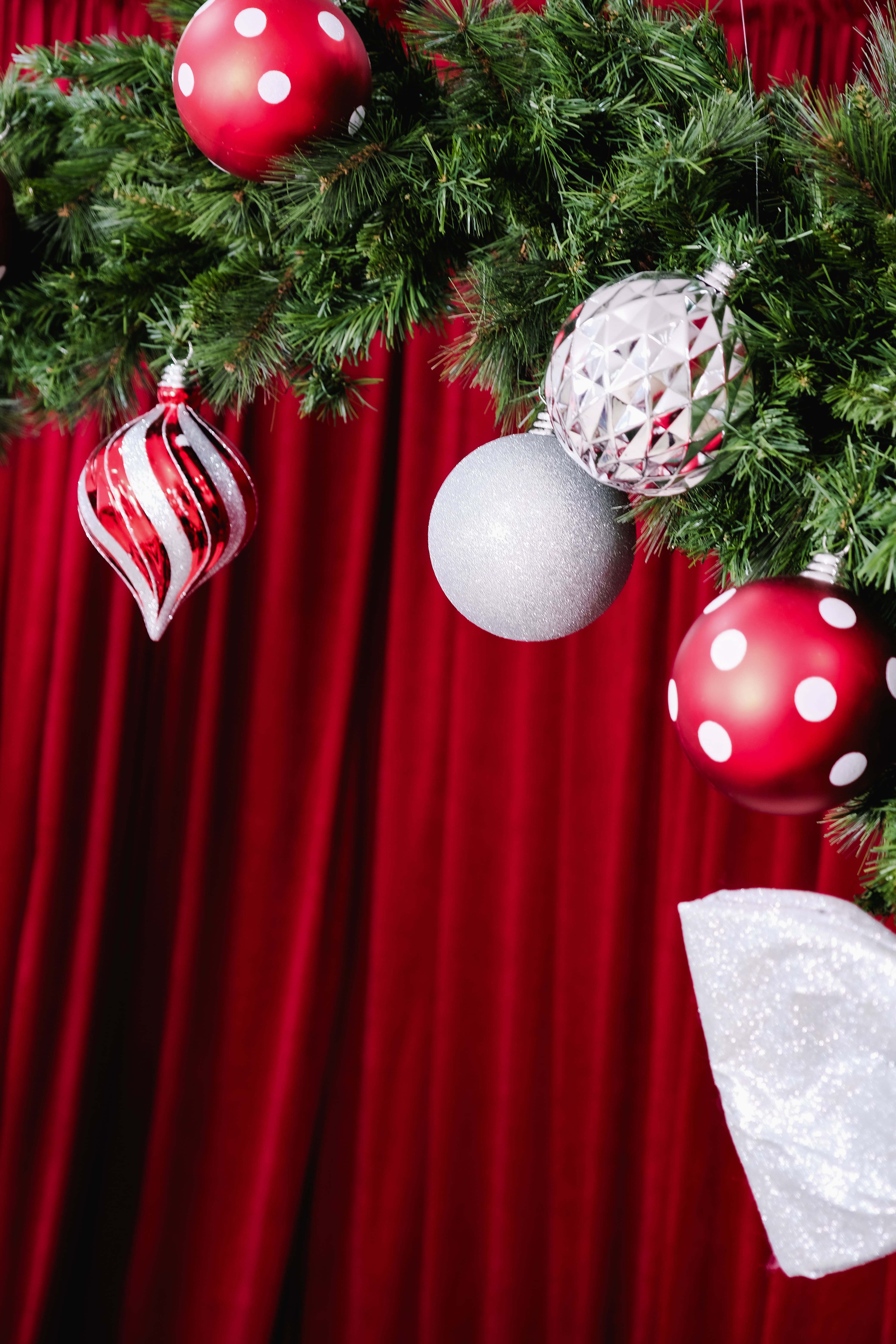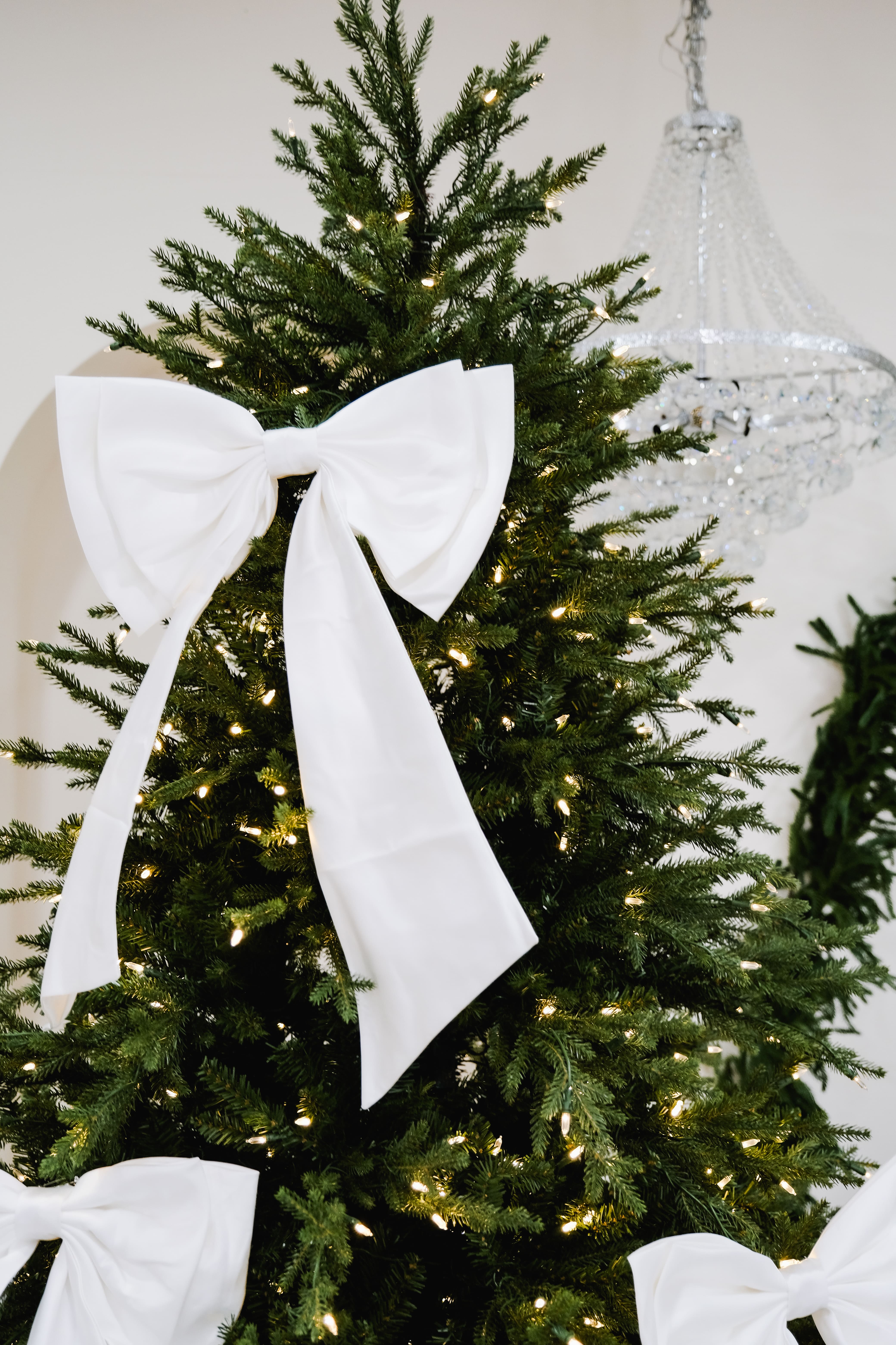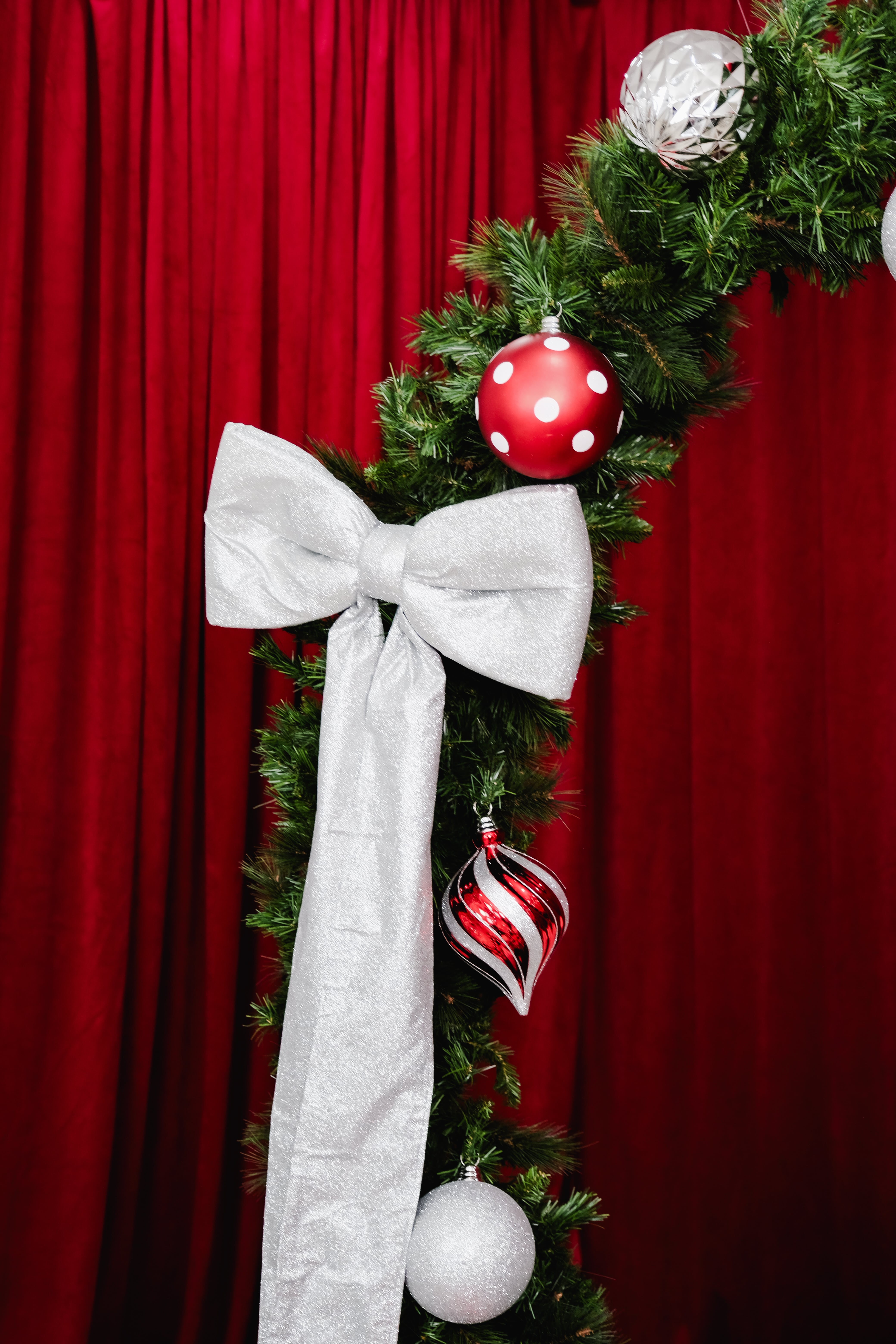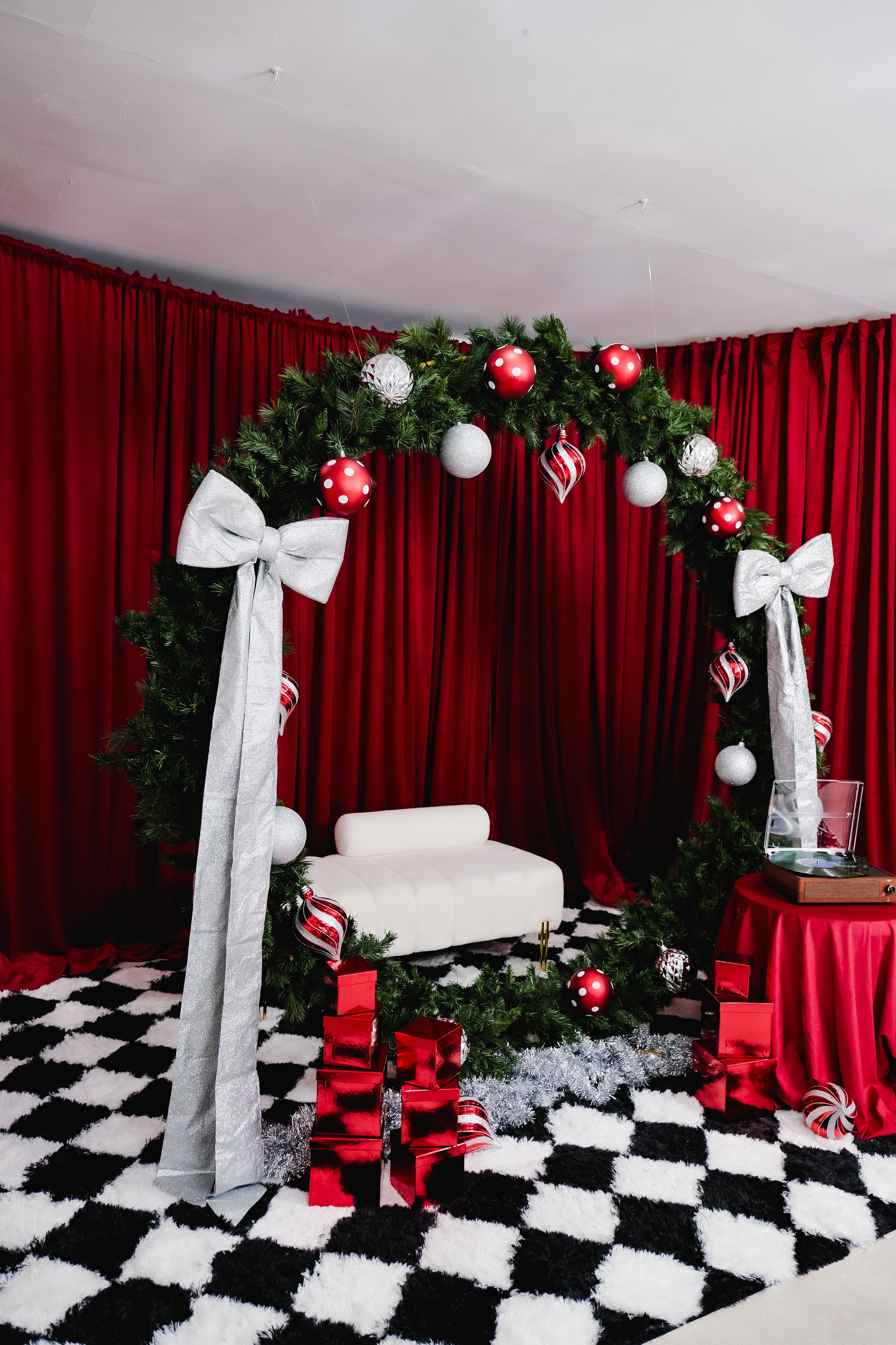 A 7.5-ft evergreen wreath wrapped in a bold red ribbon frames a cozy bench and old-world mantel. Vintage ornaments, stacked gift boxes, and warm lights bring depth and nostalgia. The oversized wreath becomes the focal point—perfect for centered portraits, close-ups, and candid moments that feel timeless and festive.
